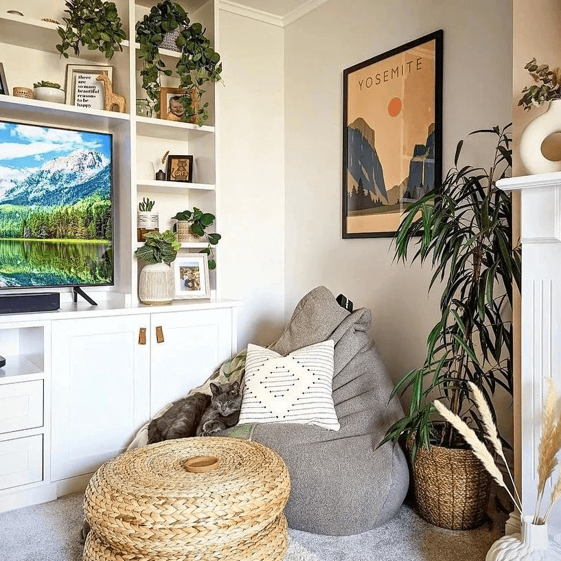 - استخدام النقوش المتناغمة: يمكن استخدام الطبعات والنقوش المتناغمة على مخدات الكنب وكراسي البين باج، مثل الخطوط أو النقوش الهندسية أو الأزهار. ويمكن أيضًا استخدام الطبعات المختلفة بشرط أن تكون متقاربة من بعضها البعض.