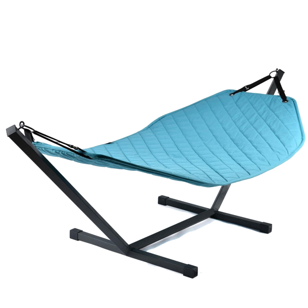 استمتع بأفضل لحظات الاسترخاء مع مرجيحة الهاموك الخارجية بلونه الأزرق المشرق، فهي لا تبدو رائعة فقط، ولكنها توفر أعلى مستوى راحة قد تصل له. قماش الارجوحة المبطن يعطي سرير مرجيحة راحة اضافية بالاضافة الى متانة وقوة تحمل عالية. الطبقة الداخلية من القماش مغلفة لتعطيها قدرة تحمل كبيرة من المطر. كما ان الخامة الخارجية معالجة بطبقة حماية من البهوت بسبب أشعة الشمس. تتكون المجموعة من ارجوحة مبطنة قابلة للفك بسهولة من الاطار الفولاذي، مزودة باطار معزز بحيث تحتفظ الارجوحة على شكلها بدون الالتفاف حول الجسم فور الاستلقاء عليها. ويوجد في المنتصف فتحة صغيرة تسمح بتصريف الماء أثناء المطر. يتم تثبيت ارجوحة استرخاء على اطار مرتبط بالهيكل الفولاذي لمنع الاحتكاك، يعتبر سرير هاموك خيارًا مثاليًا للاسترخاء في الحديقة أو على الشاطئ، حيث يوفر لك تجربة استرخاء مريحة وممتعة تحت أشعة الشمس أو في الظل.