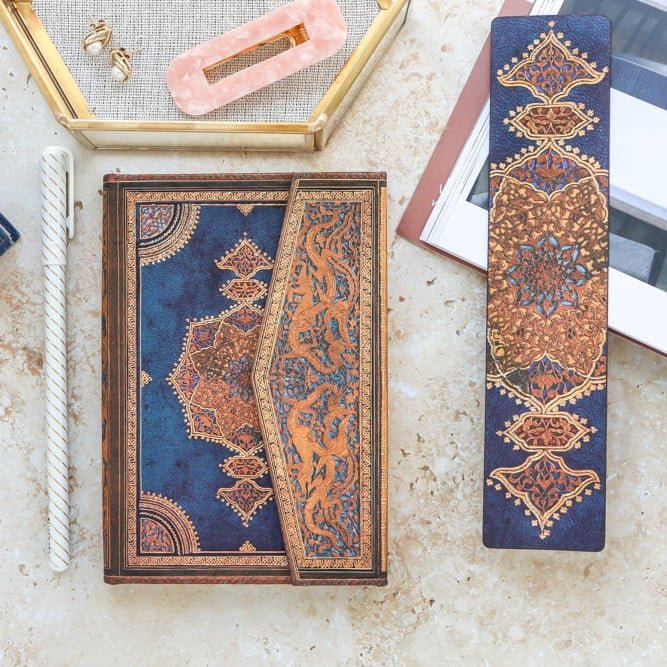 هذا التصميم الصفوي باللون النيلي الداكن يعيد تصميم النقش الجلدي المزركش بتفاصيل زخارف يدوية، فروح تصميم غلاف دفتر مقسم وسط Safavid Indigo ” مخطط ” يعيد أناقة العصر الإسلامي الذهبي حتى في سياقنا الحديث، تم إصدار نسخه من غلاف دفتر حجم وسط سابقا بتصميم جلدي بني تقليدي، أضيف اللون الأزرق الداكن في هذا الاصدار الجديد ليعكس دور الدولة الفارسية في العصر الاسلامي.